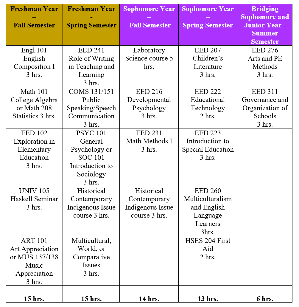Students seeking this training, first complete the Associates of Arts degree in Para-Professional Education during freshman and sophomore enrollment. Courses within the Para-Professional Education program guide students to meet the general education requirements specified by Haskell Indian Nations University as well as course work within the ETEP to support a career in para-professional education.