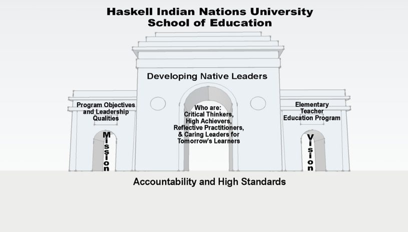 The Haskell Memorial Arch, located on campus, serves as a model for the School of Education’s (SOE) Conceptual Framework (CF). This model illustrates the solid foundation of knowledge and skills needed to develop Native Leaders who become critical thinkers, high achievers, reflective practitioners, and caring leaders for tomorrow’s learners. This model symbolizes the importance of two main support systems; the mission and the vision, which are built upon quality standards and accountability. The evaluation process includes a variety of assessment tools and practices with transition points throughout the program to monitor and enhance the candidate’s growth and development.
